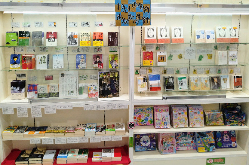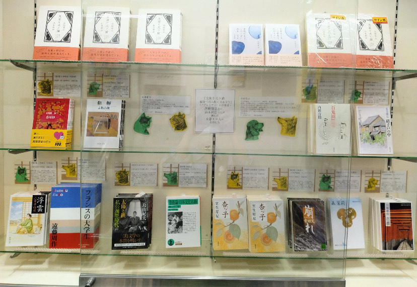 吉祥寺ブックスルーエの階段踊り場にて、9月6日より『わたしの名作あなたの名作』フェアが開催中。弊社刊『文豪と犬と猫 偏愛で読み解く日本文学』著者の宮崎智之・山本莉会が本書に登場する12人の文豪の名作を選書し、コメントを寄せています。なんと選書コメントのフリー冊子も作ってくださいました(ブックスルーエ様、ありがとうございます)!